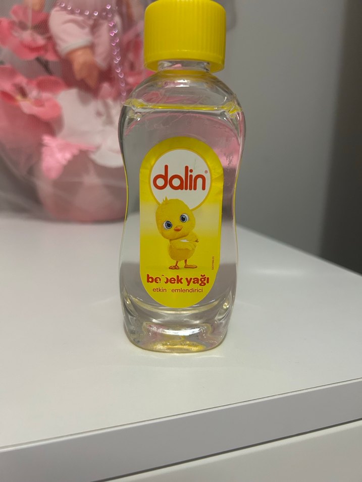 Dalin bebek yağı, 100 ml şişede bebeğin cildini nazikçe nemlendirir. Sarı kapaklı, civciv figürlü ambalajda.