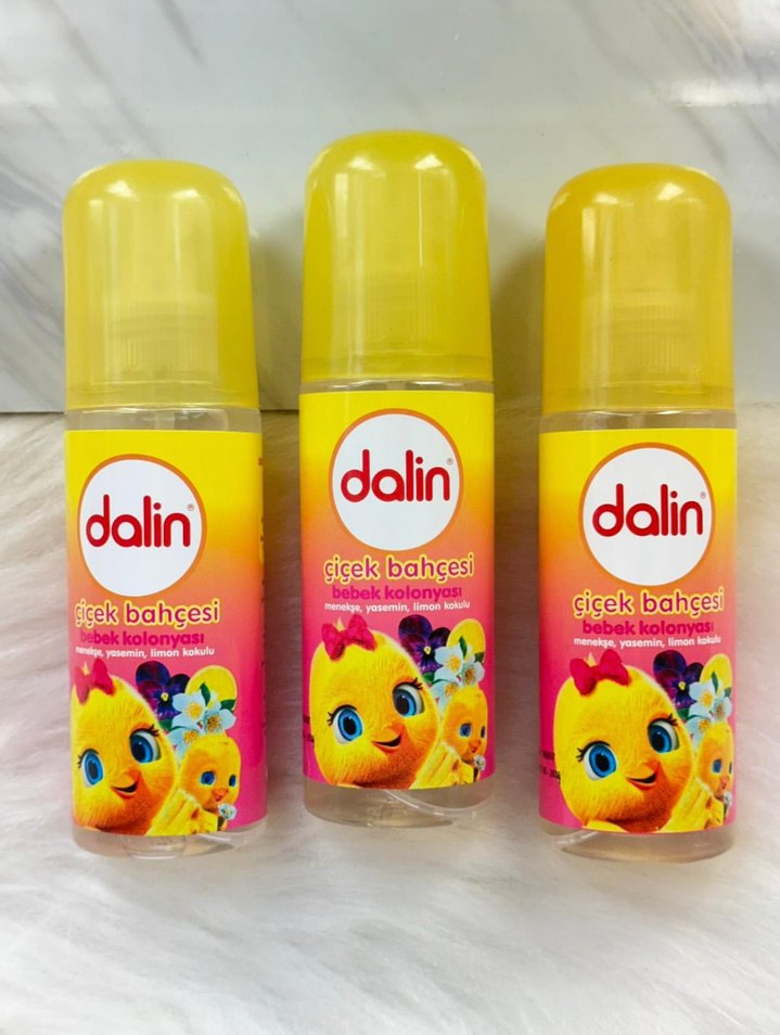 Dalin Çiçek Bahçesi bebek kolonyası, karanfil, yasemin ve limon kokuları içerir. Sarı kapaklı, kullanımı kolay üçlü set.