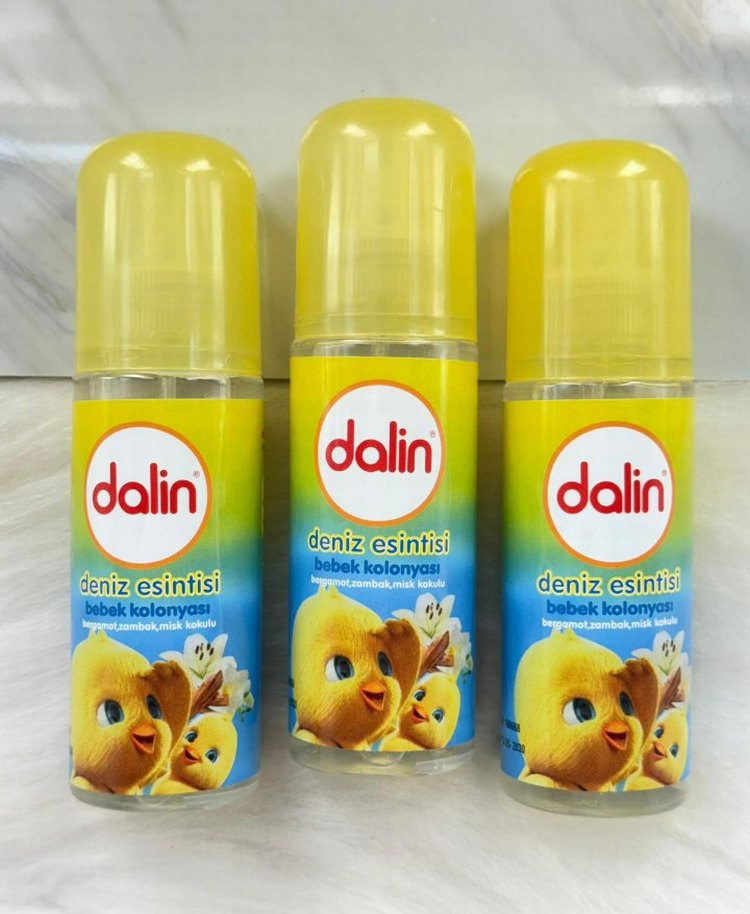Dalin Deniz Esintisi bebek kolonyası, limon, lavanta ve misk kokularıyla ferah bir deniz esintisi sunar. Sarı kapaklı sprey şişede.