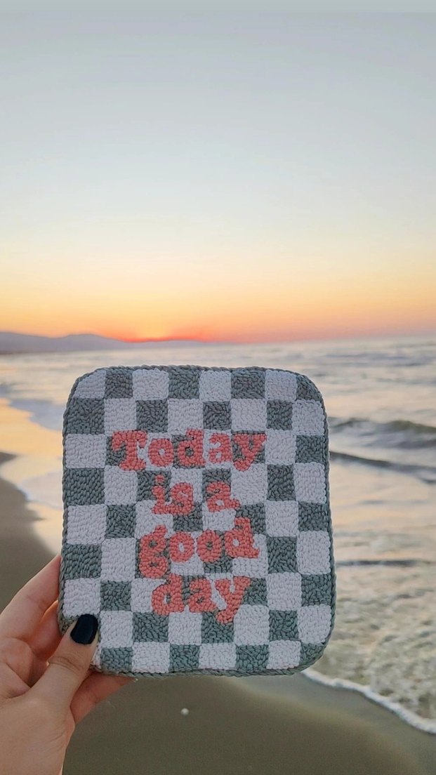 Üzerinde 'Today is a good day' yazılı ve dama desenli punch nakışı hediyelik duvar panosu.