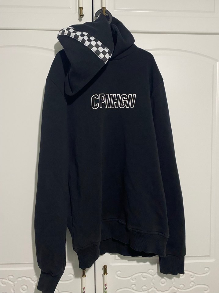 Siyah kapüşonlu sweatshirt, bol kesim, uzun kollu ve fermuarlı detaylıdır. Kapüşonda kareli desen ve göğüste 'CPNHGN' yazısı bulunur. Yumuşak ve sıcak kumaştan üretilmiştir. Arkasında ufak lekeler var bu kadar