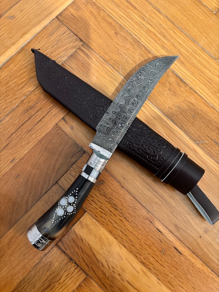 Damascus Çelik balçaklı kılıflı telkari işlemeli boynuz kabza.