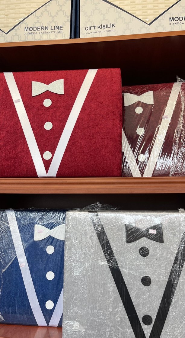 İçerisinde beyaz gömlek kravat pijama parfüm kemer cüzdan terlik vardır