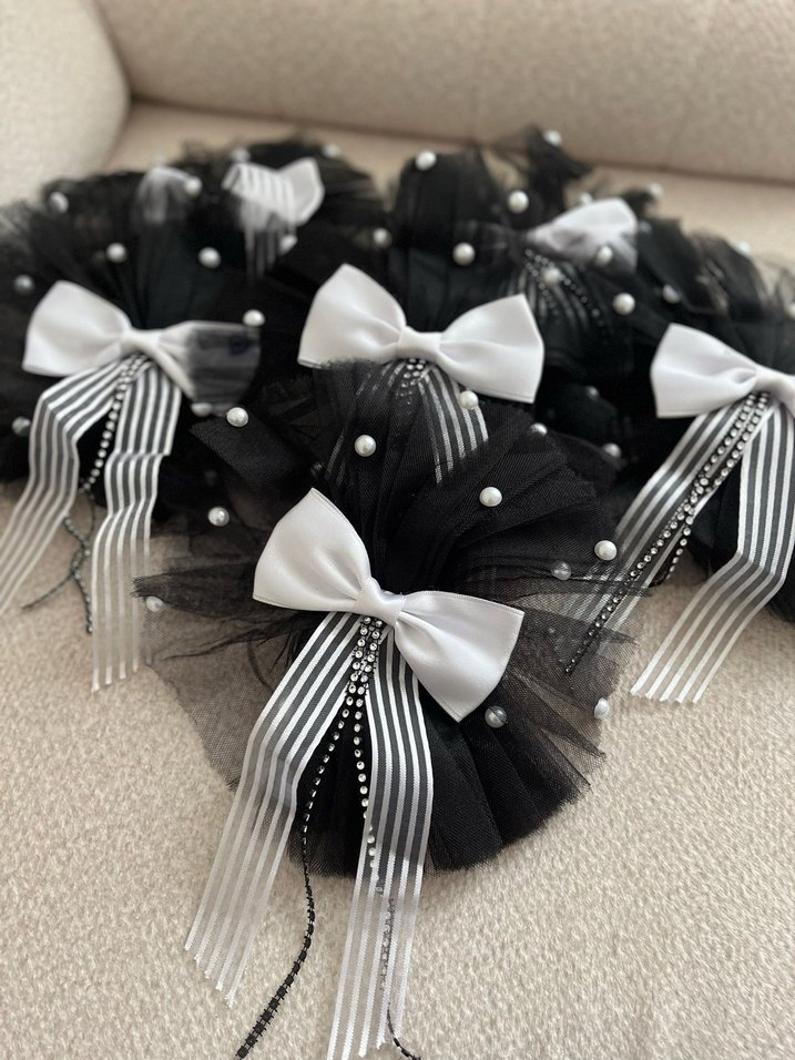 Siyah sentetik kumaştan yapılmış, beyaz fiyonk, çizgili kurdele ve inci detaylı gotik Paris tarzı saç aksesuarı.
