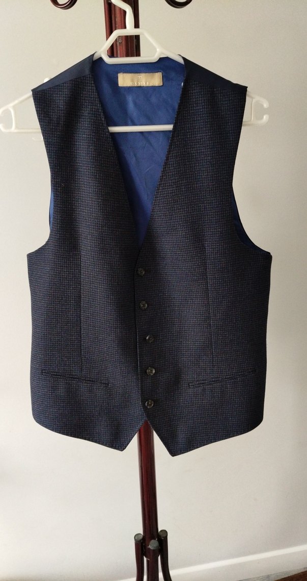 Bu erkek yeleği düğmeli, yün kumaştan yapılmış ve koyu gri renktedir. Normal kesim ve yakalıdır, ofis kullanımı için uygundur.