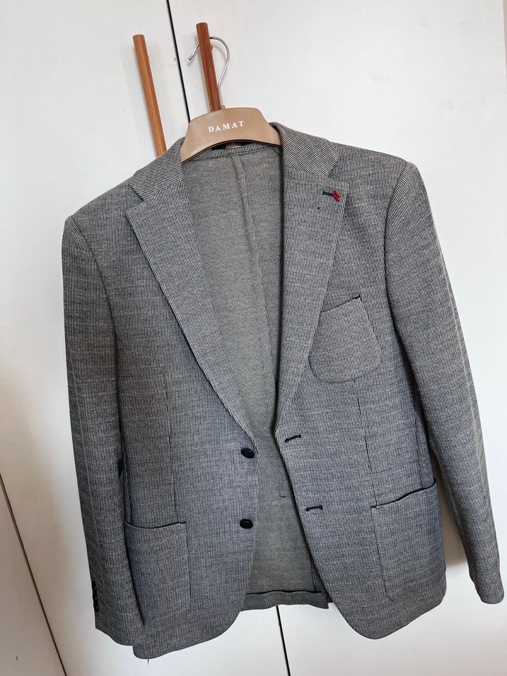 Damat marka, keten kumaştan yapılmış gri ceket, klasik kesim, düğmeli ve normal uzunluktadır. Ofis için uygun, modern klasik tarzda, uzun kolludur. Çantası ile beraber gönderim yapılır