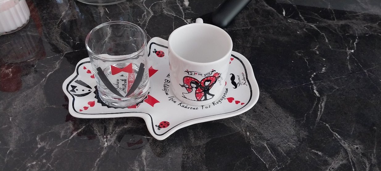 Kalp ve uğur böceği desenli beyaz fincan ve tabak seti, aşk temalı eğlenceli tasarımla. sadece 1 kez istemeye kullanildi