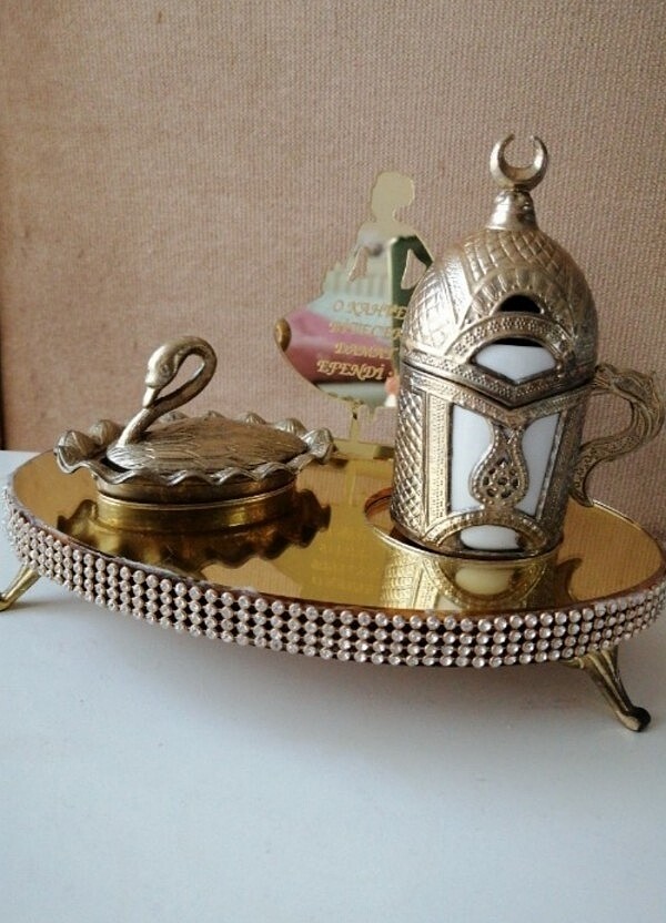 Hiçbir defosu yoktur. Lokumluk, kahve fincanı, sunum tabağı ve yazılı pleksi tabelası içeren damat kahvesi seti.