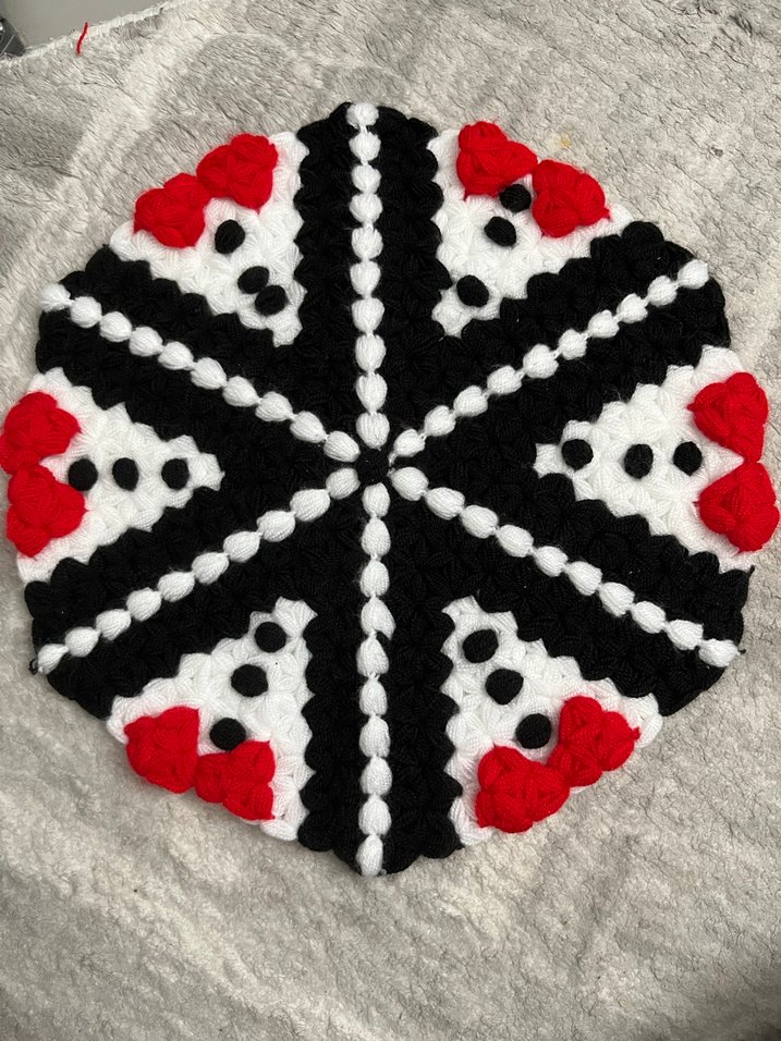 Yuvarlak, kırmızı, siyah ve beyaz desenlere sahip damat lifi