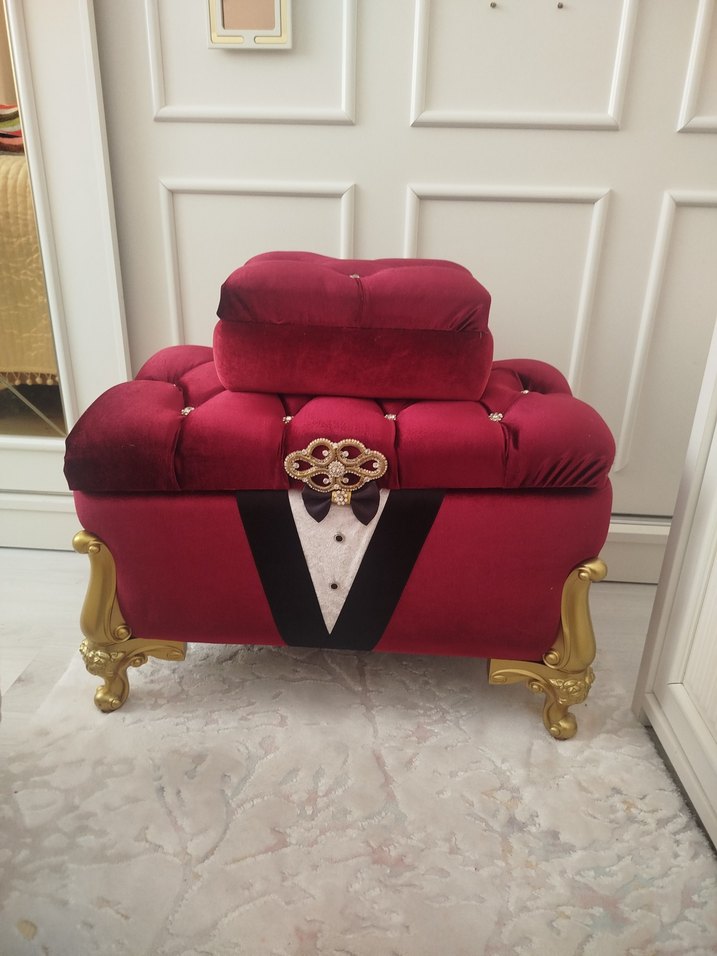 Düğmeli, mini boy, bordo renkli, desenli, askılı kollu ve kesik yaka detaylı, Paris tarzı modern klasik kesim damatlık.