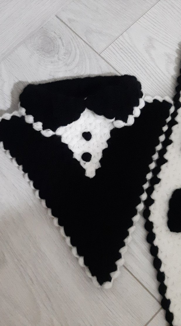Nakışlı detaylara sahip siyah bebek önlüğü, üçgen şekilli ve beyaz kontrast kenarlarla süslenmiştir.