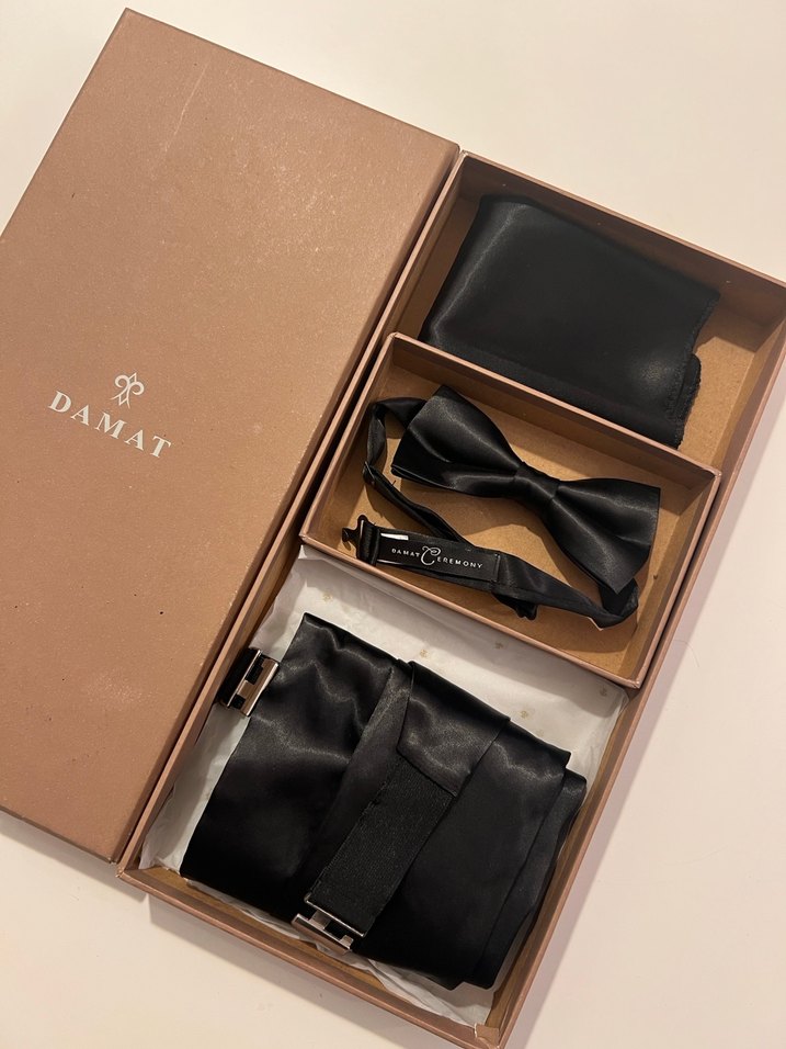 Damat markasının siyah desenli papyon, uyumlu cep mendili ve askıdan oluşan seti, modaya uygun ve avangart tarz için idealdir. 1 kez eşim evlenirken kullanıldı. Temiz hasarsız kutulu.