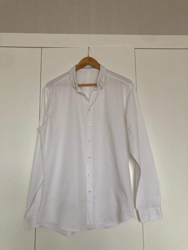 Erkekler için beyaz keten gömlek, düğmeli ve klasik yakalıdır. Regular fit, uzun kollu ve ofis için uygundur. Minimalist, desen içermeyen sade bir tarza sahiptir.
