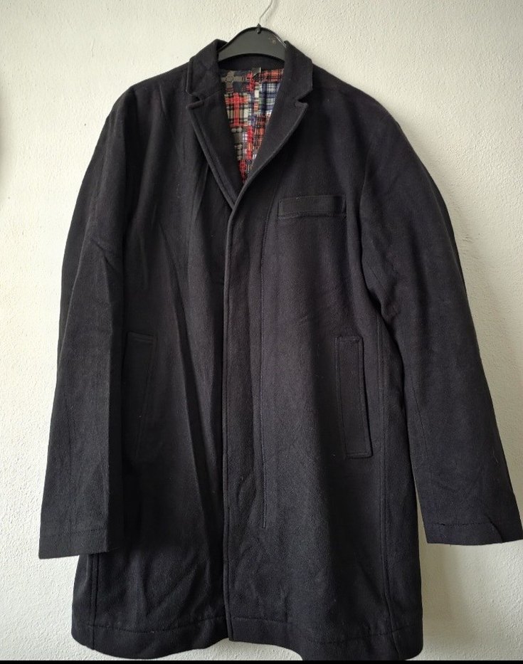 Düğmeli, gri renkte, normal boyda erkek palto. Notch yaka ve uzun kollu, rahat kesim, günlük ve iş tarzına uygun. kase