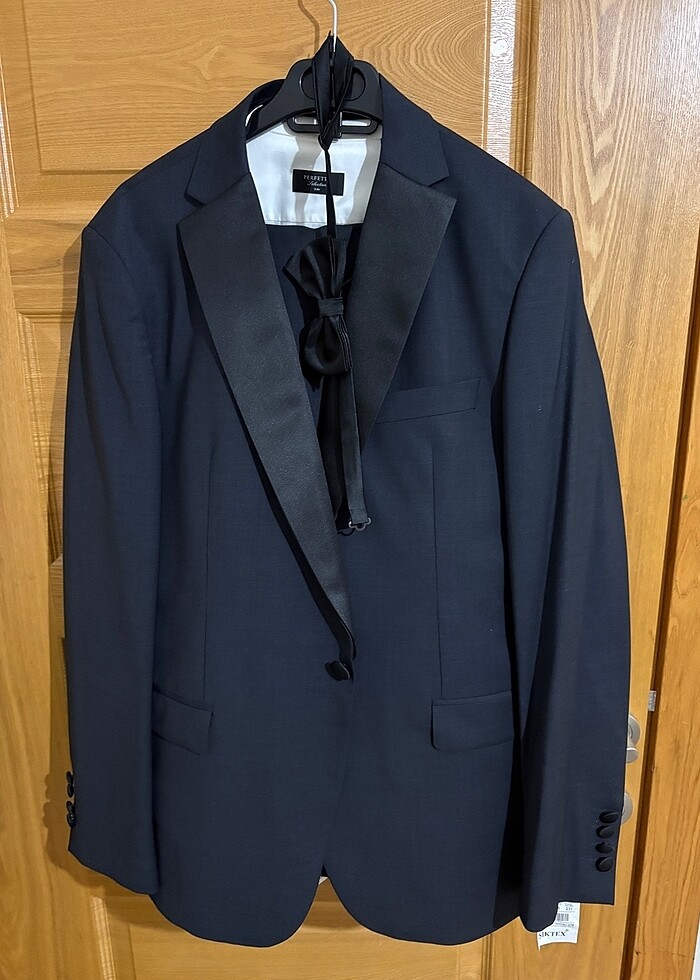 2 kere giyilmiştir. Papyon yaka çiçeğine kadar takım olarak gönderilecektir. Tertemizdir. 95-100 kg arası 1,95 boy ile giyilmiştir. Kılıfı da gönderilecektir. 56-6 bedendir