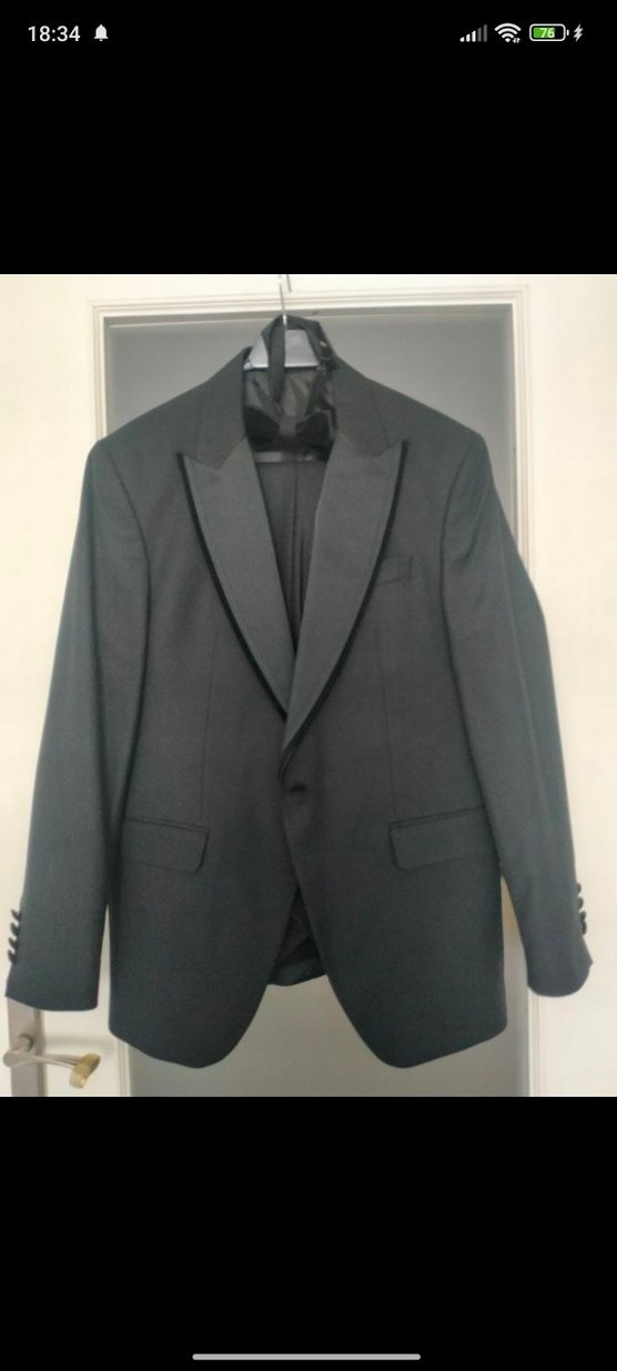 Düğmeli, açık yaka siyah erkek takım elbise ceketi. Uzun kollu, normal kesim ve modern klasik tarzda, iş ortamına uygundur. ürün 1 kez giyilmiştir. ( ceket, pantalon, gömlek, yelek,papyon) ✨