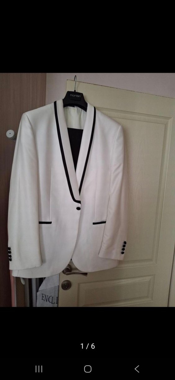 Beyaz, parlak kumaştan uzun kollu erkek ceket, düğmeli ve keskin yaka detaylarıyla klasik ve modern bir şıklık sunar. pantolonu var takım bel 96 boy 106 paça genişlik 21 cm 1 kez oğlum düğünde giydi temizletildi
