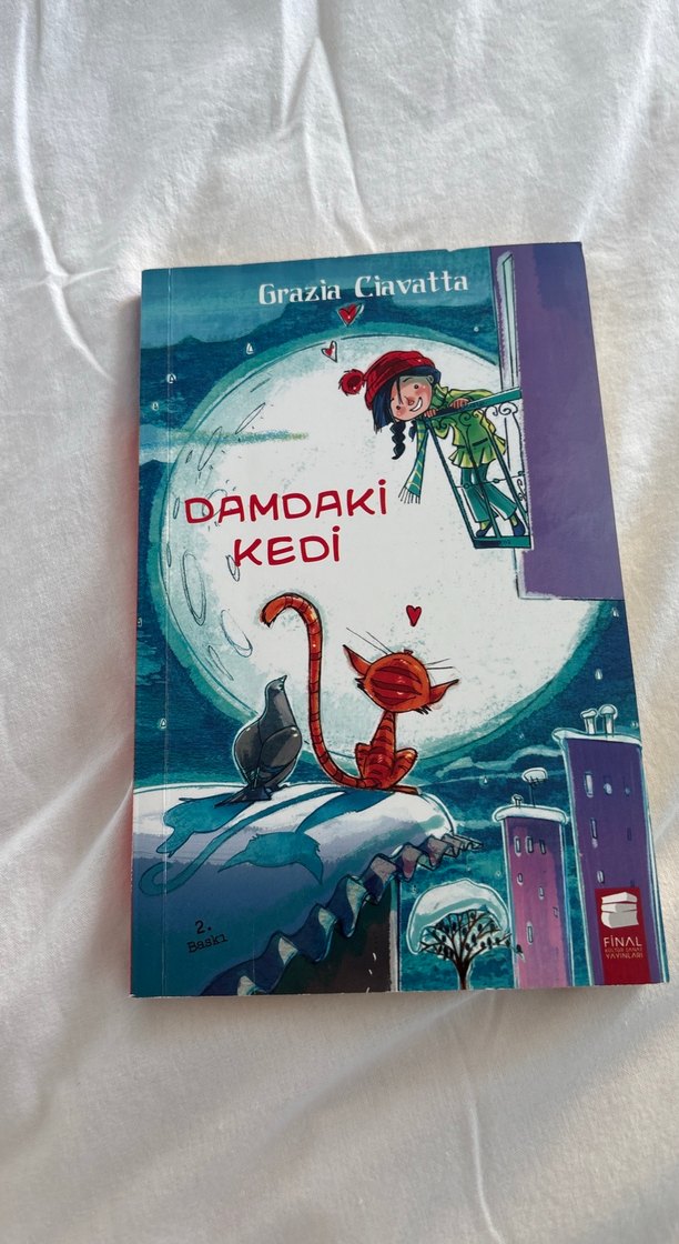 Grazia Ciavatta'nın Damdaki Kedi adlı çocuk kitabı, ay ışığı altında çatıda bir kız ve kedinin renkli çizimleriyle sevimli bir hikaye anlatıyor.