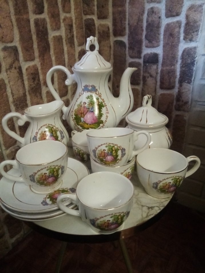 Beyaz porselenden yapılmış, çaydanlık, şekerlik, sütlük ve altılı fincan takımı. Pastel renklerde çiçek ve figür desenleri ile süslenmiştir. Not: Çay altı 3 adet tir, sütlük olan kırık yapıştırma yapıldı ve 2 fincanda atık mevcuttur. Resimlere bakınız. Bu haliyle 750 lira