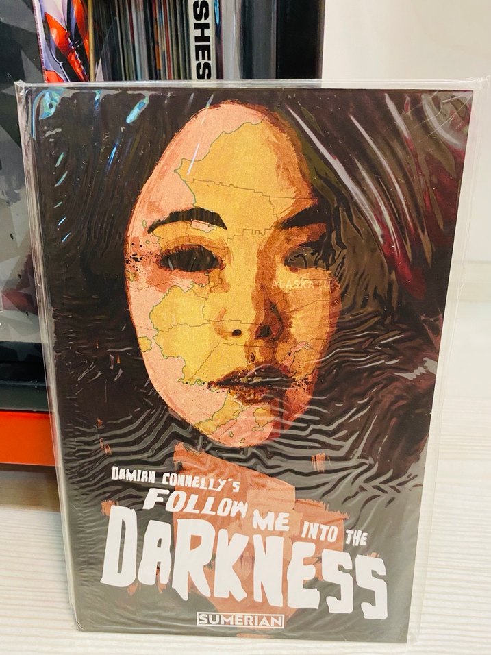 Damian Connelly'nin Follow Me Into the Darkness adlı çizgi romanı, kadının yüzünün karanlık ve soyut bir arka plana karıştığı dikkat çekici bir kapağa sahip. Sumerian tarafından yayımlandı.