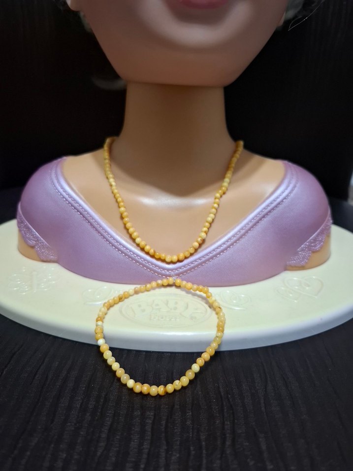 Damla kehribar kolye ve bileklik. Kolye klipsli,bileklik lastikli. Taş ebatları 3,5 mm, kolye uzunluğu 55,5 cm
