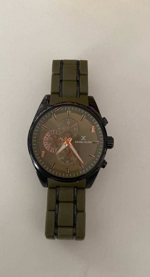 Daniel Klein erkek saati, koyu haki renkli kayış ve kadran ile sokak tarzı tasarıma sahip. Çok fonksiyonlu kronograf ve şık siyah kasa içerir. ⌚
