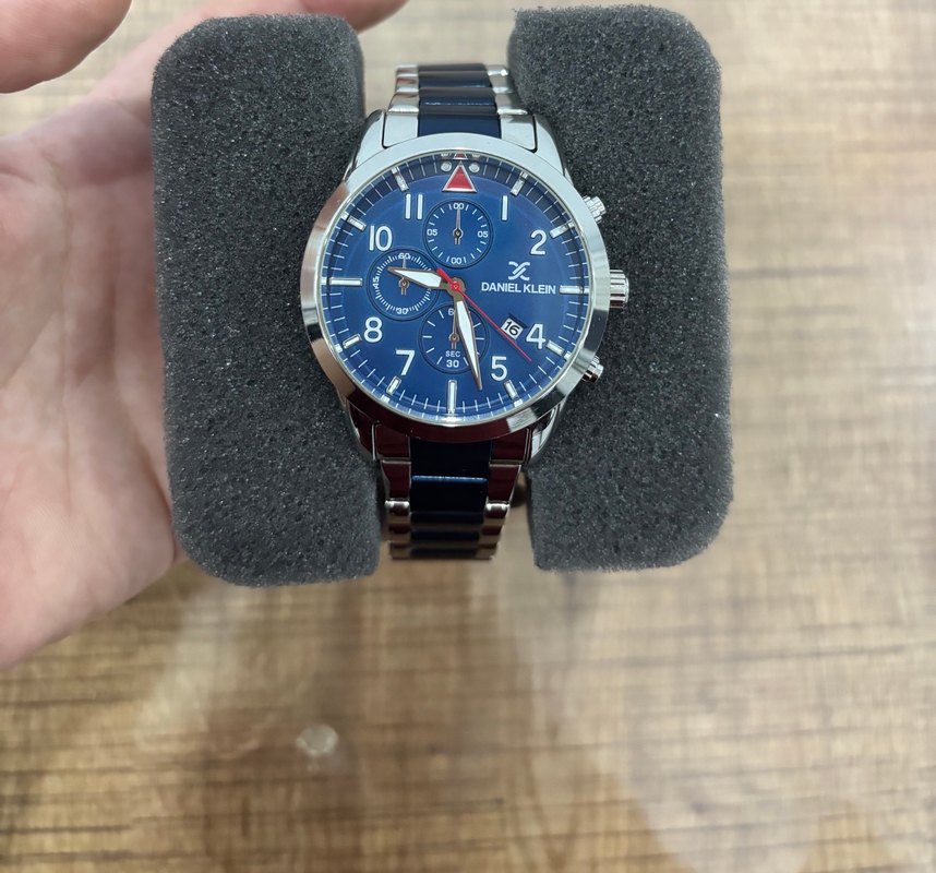 Daniel Klein erkek saati, lacivert kadran, çelik kasa ve uyumlu bilezikle modern tasarıma sahip. Tarih göstergesi ve çoklu alt kadranlar içerir. Orjinal ürün