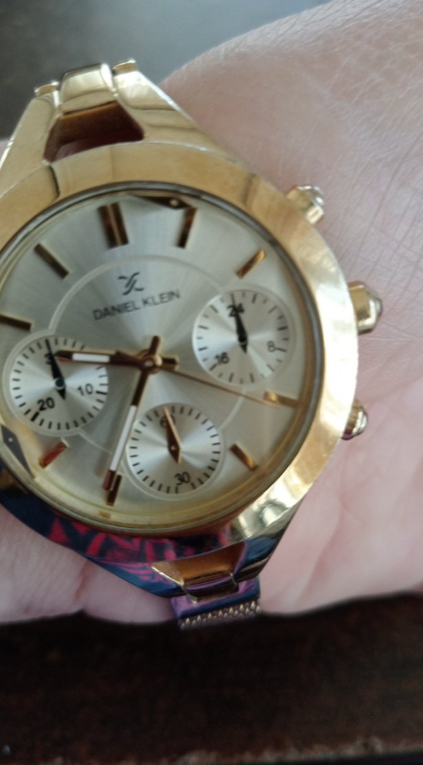 Daniel Klein markalı, parlak altın renkli kasaya ve tokalı kayışa sahip kadın saati. Klasik tasarımlı, üç alt kadranlı ve net kadranlı, iş ortamına uygun.