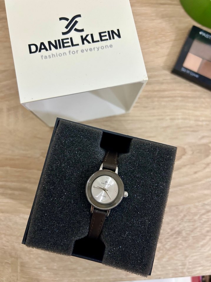 Daniel Klein kadın saati, koyu kahverengi kayış, metalik kadası mevcut. İnce bilekler için ideal. Kayışını ben değiştirmiştim siyahtı. Çok uzun süredir kenarda kutuda duruyor. Kullanmadığım ve kendime yakıştırmadığım için satıyorum. Ekranında çok ince kullanıma dair 2-3 çizik var ama fotoğrafı detaylı çektim yansıma olmadığı sürece gözükmüyor da.