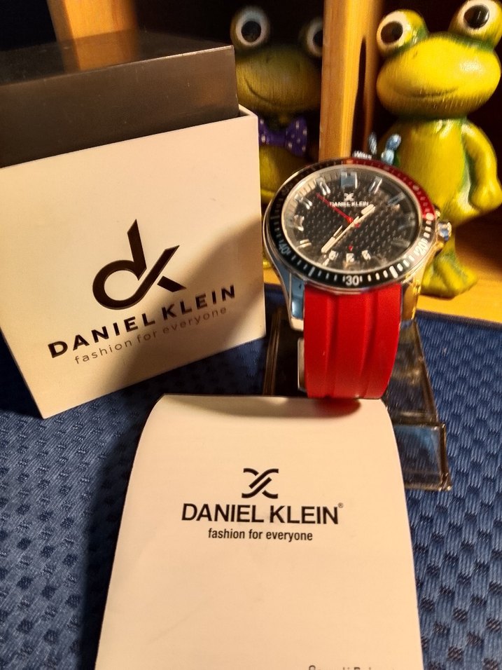 Daniel Klein erkek saati, koyu kırmızı biker tarzı kayış ve detaylı kadran ile sokak stiline uygun. Orijinal kutusunda. ⌚