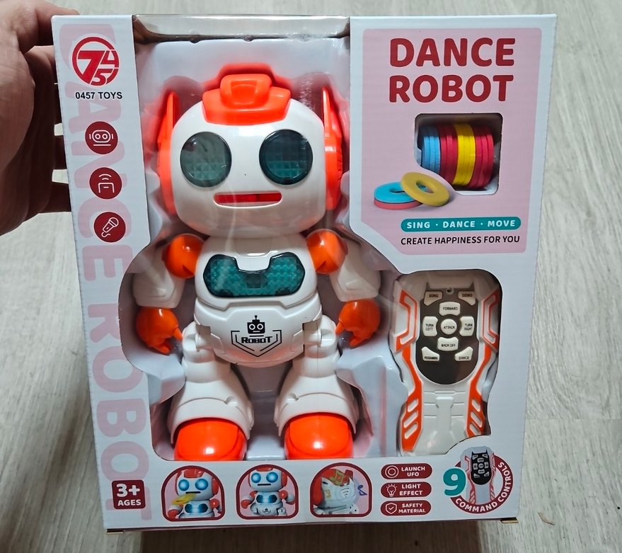 Uzaktan kumandalı, şarkı söyleyen ve dans eden renkli turuncu-beyaz robot oyuncak. 3 yaş ve üzeri için uygundur.