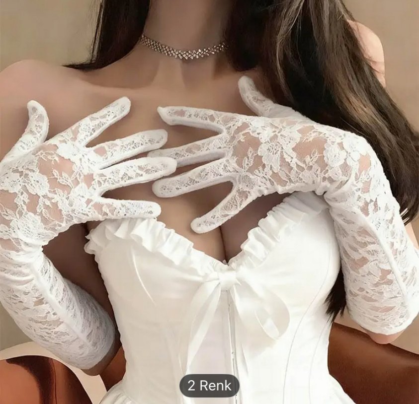 İpek gibi kumaştan, dantel detaylı beyaz kadın eldivenleri, zarif ve şık İTHAL SIFIR ÜRÜNDÜR XS BEDENDEN XXL BEDENE KADAR MEVCUTTUR RENK SEÇENEKLERİ SİYAH VE BEYAZ ALIM İÇİN RENK VE BEDEN BELİRTEREK İLAN AÇTIRINIZ