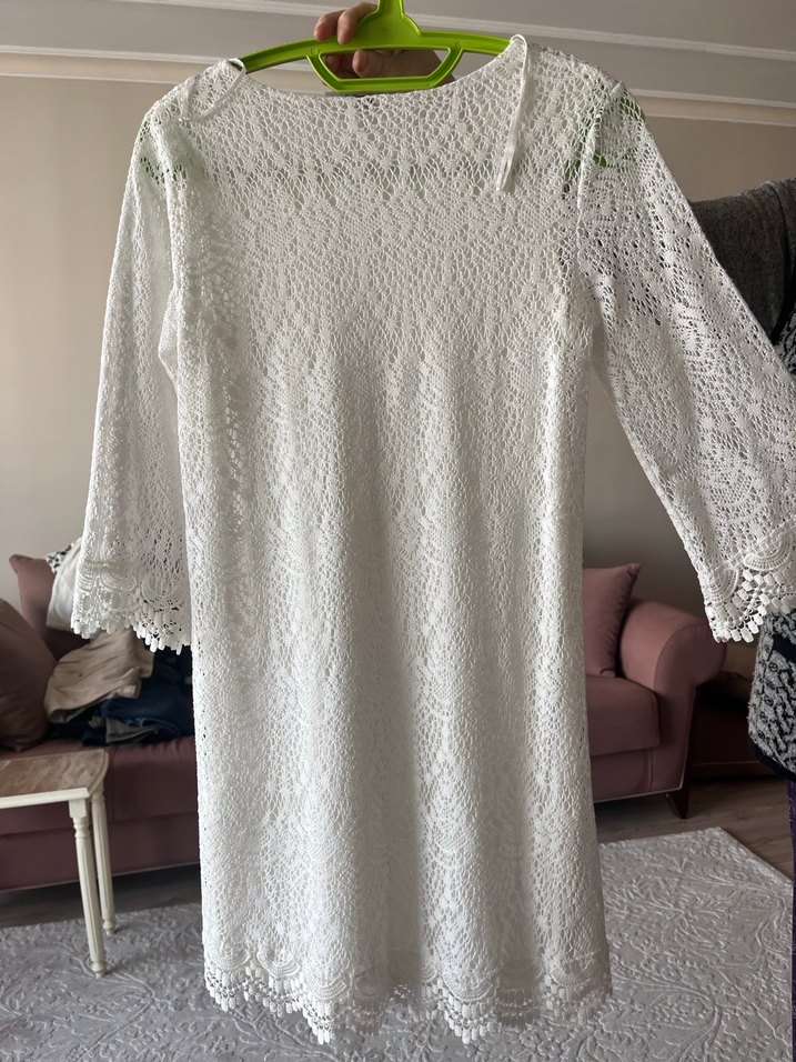 Bu beyaz dantel midi elbise uzun kollu, yuvarlak yakalı ve bol kesimdir. Bohem tarzını yansıtır, hafif kumaşı günlük kullanıma uygundur.