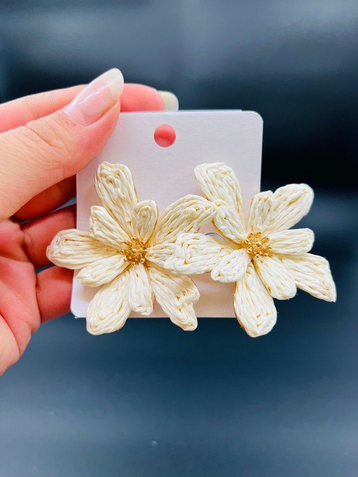 Dantel detaylı beyaz çiçek desenli midi uzunlukta, bohem tarzda ve minimal sade küpelerdir. Düğün için uygundur.