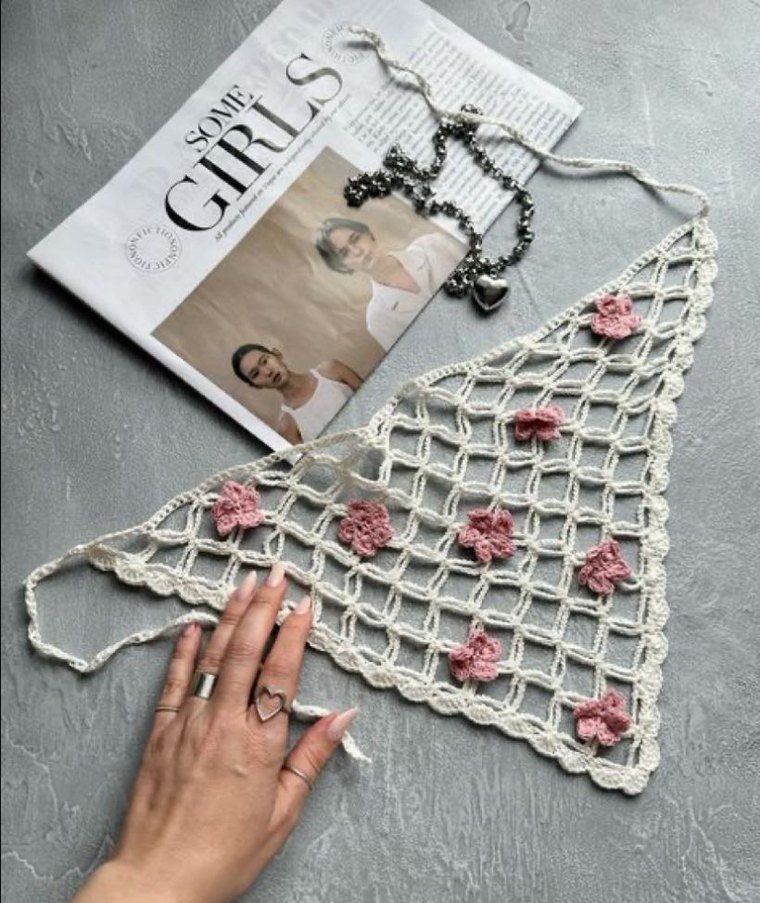 Bohem tarzda, dantel ve pembe tığ işi çiçek detaylı gri örgü desenli kadın bandana. Günlük kullanıma uygun.