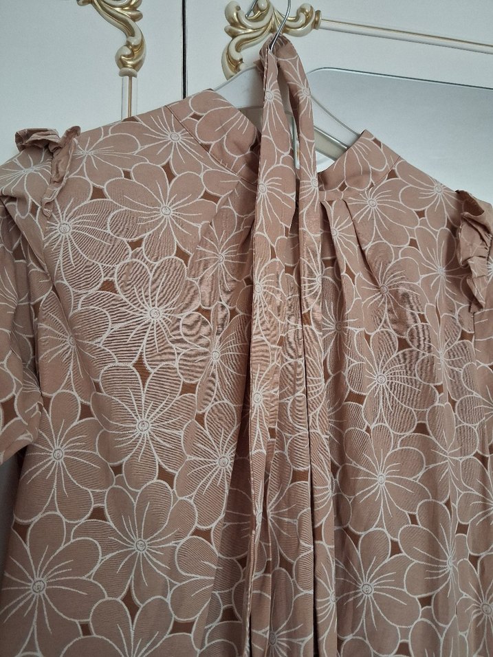 Çiçek desenli dantel desenli tunik, halter yaka ve askılı kollu. Bol kesim ve uzun boy, bohem tarzı için uygun.