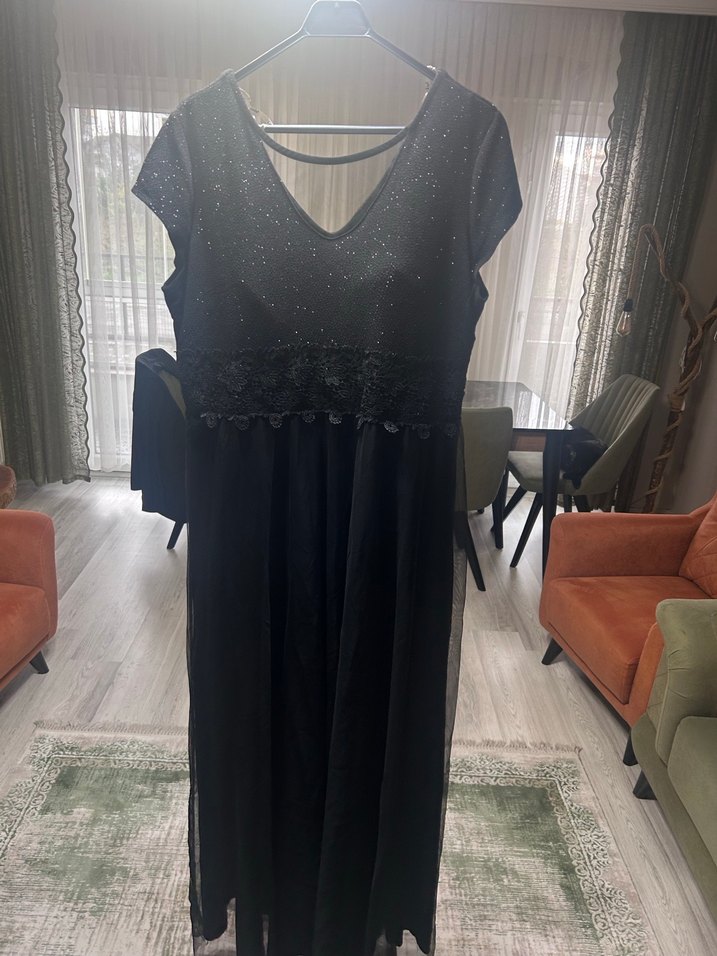 Üstü simli dantel detay altı astar ve şifon elbise. Göğsü kaplıdır. Sorunsuz. Bir kere giyildi. İki Koltukaltı 54cm boyu 160cm.