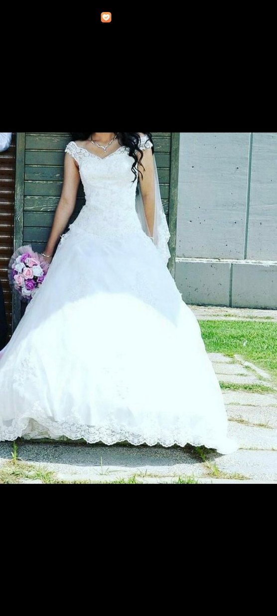 Dantel detaylı, askısız, uzun beyaz A kesim gelinlik, klasik ve zarif bir görünüm sunar. 36 bedene uyumlu