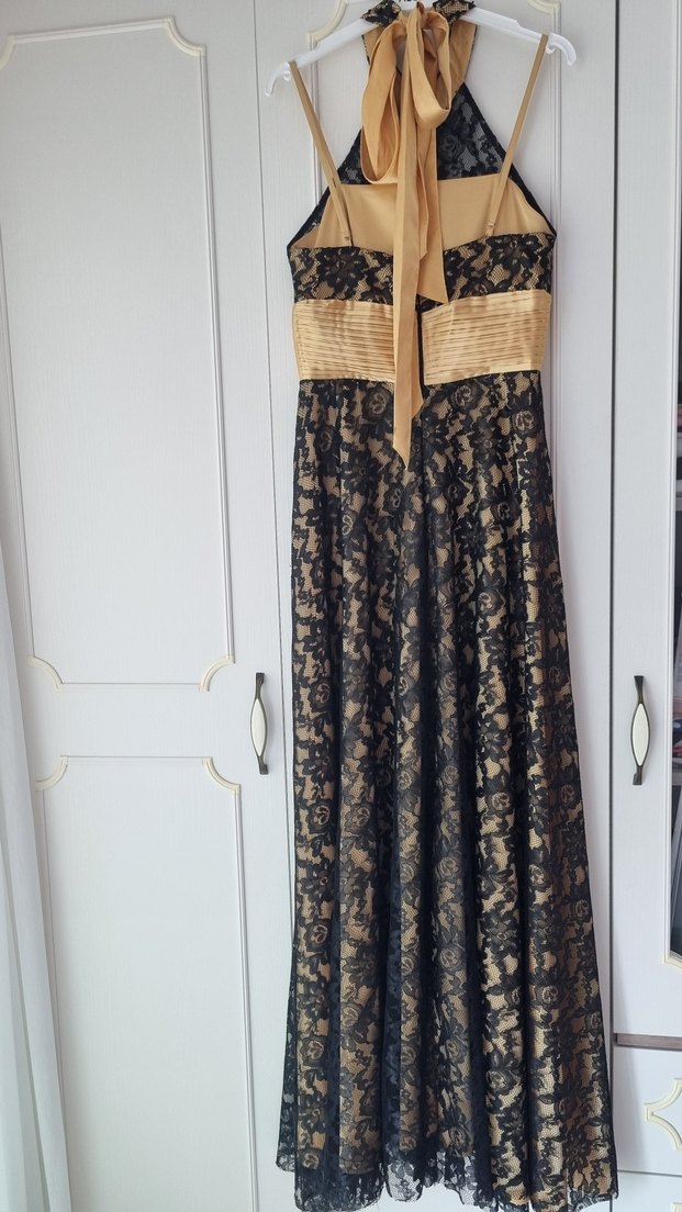 Dantel detaylı, straplez ve askılı kollarıyla, koyu altın yılan desenli, klasik uyumlu uzun abiye elbisedir. ✨