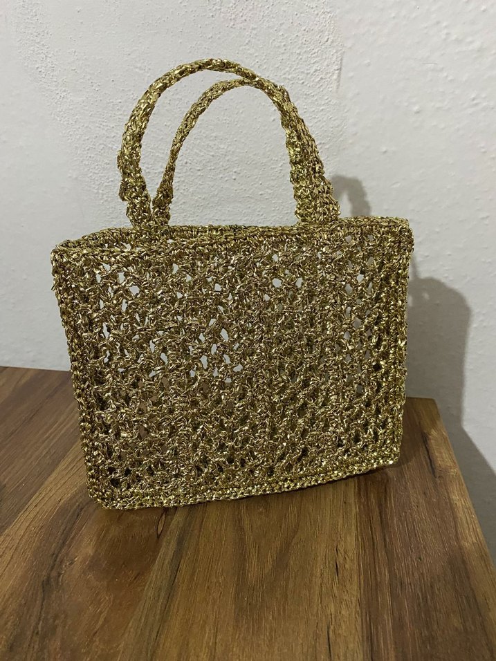 Parlak altın renkli, dantel detaylı örgü kadın çantası, minimalist bohem tarzıyla günlük kullanıma uygun. Yeni yapıldı kullanılmadı.
