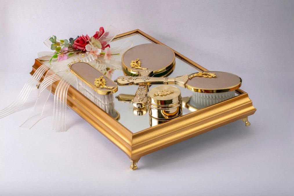 Dantel detaylı, altın renkli ayna tepsisi, el aynası, tarak, fırça ve pudra kutusundan oluşan klasik ve zarif gelin aksesuar seti.