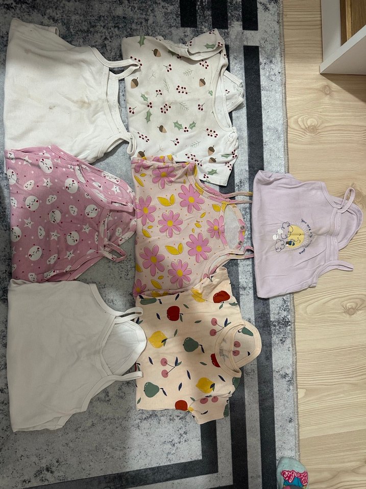 Pastel renklerde, askısız ve dantelli detaylı bebek bodyleri. Çiçek ve meyve desenli yumuşak kumaşlarla rahat kullanım sağlar.