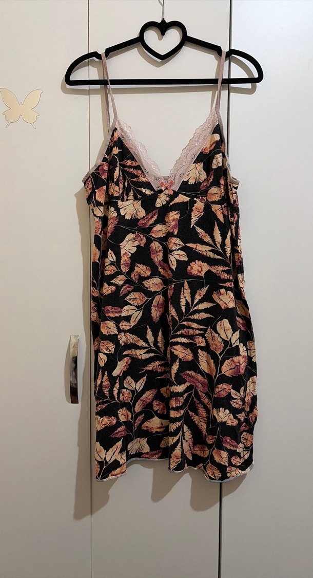 Askılı, V yakalı, bol kesim hamile geceliği. Kahverengi çiçek desenli ve dantel detaylıdır. Midi boyda ve rahat bir tasarıma sahiptir.