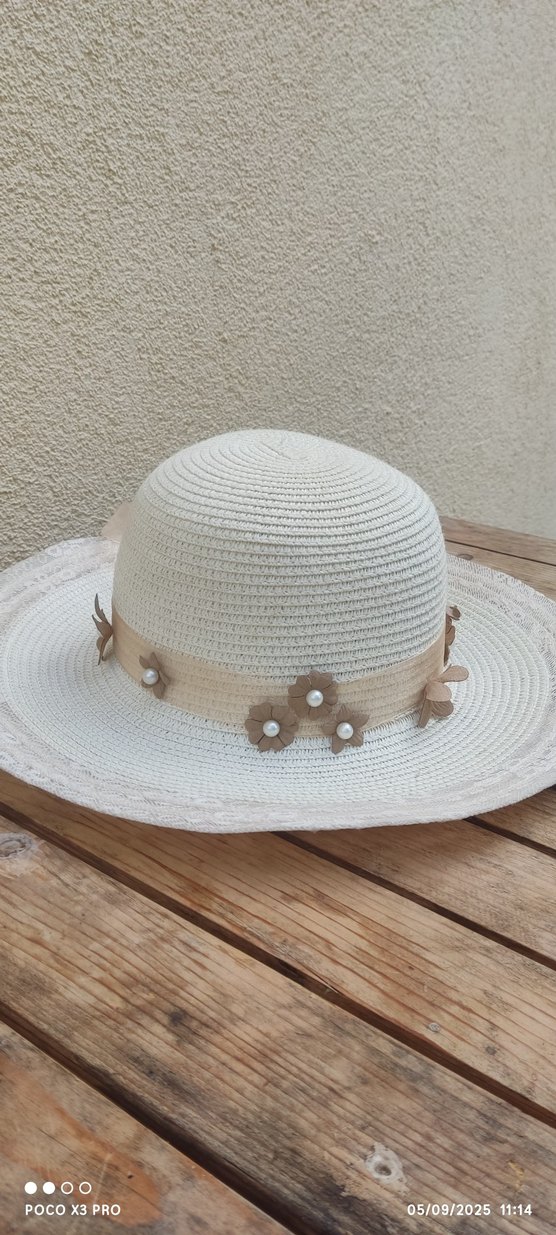 Açık bej renkli, dantel detaylı ve çiçek süslemeli, bohem tarzda kadın şapkası.