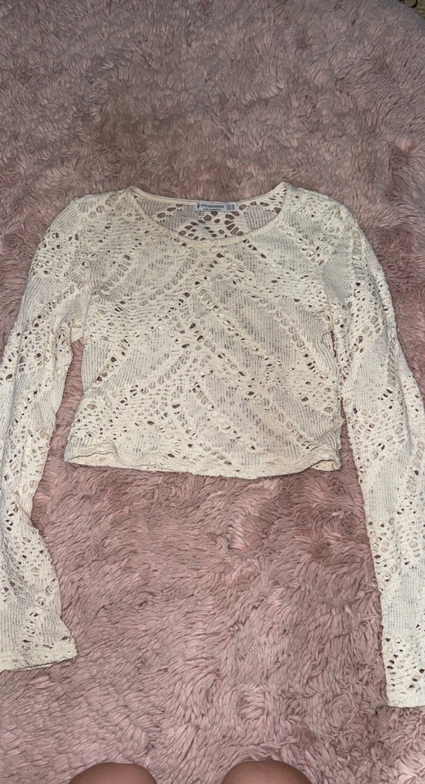 Bej renkte, uzun kollu ve tekne yaka, dantel işlemeli örme kumaştan yapılmış, bohem tarzda ve vücuda oturan kadın kazak.