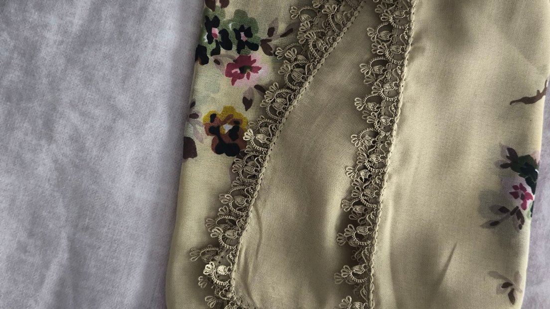 Bej renkte, dantel detaylı ve çiçek desenli tekstil şal. Bohem tarzda, yumuşak dokulu ve retro hippie havasında.