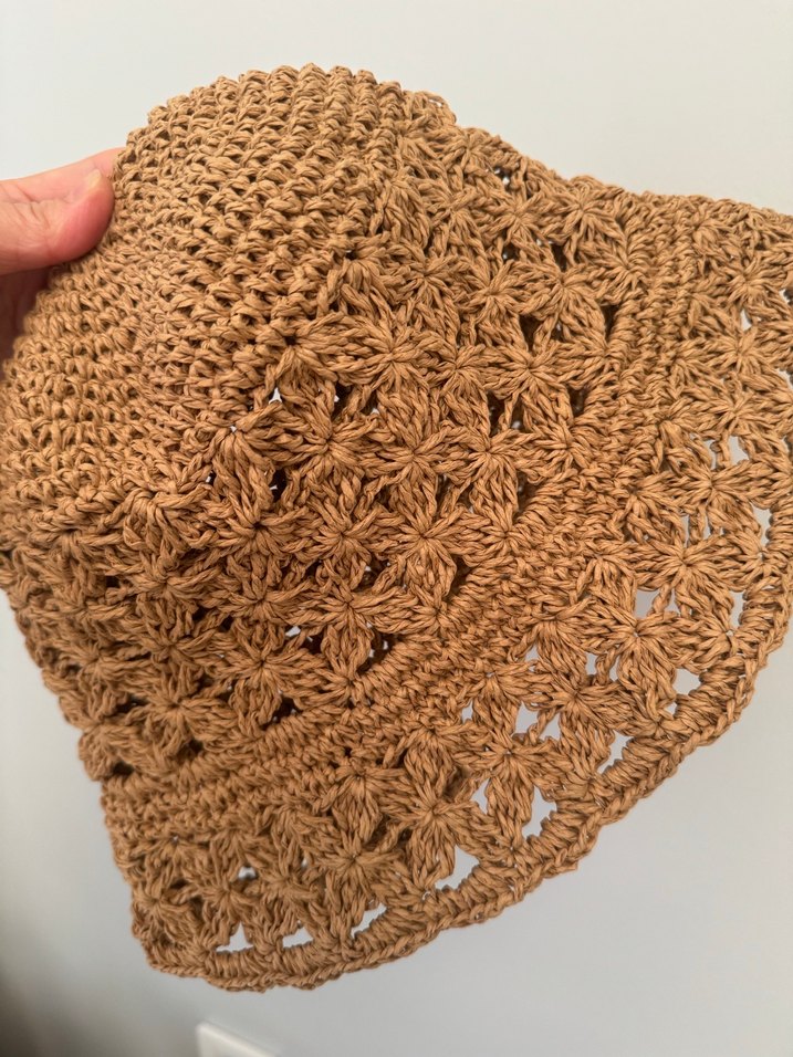 Koyu bej renkte, dantel detaylı örme kadın şapkası. Bohem, retro ve hippie tarzına uygun rahat bir model.