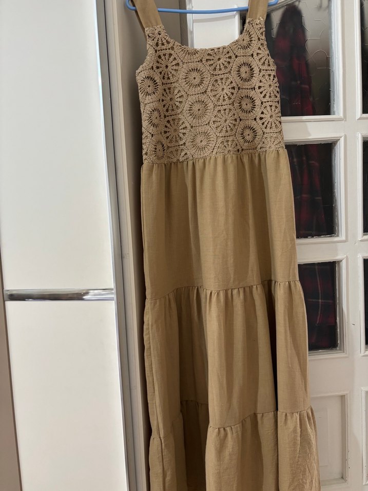Bej renkli, dantel işlemeli örgü üst kısmı ve askılı straplez yakasıyla bohem tarzda uzun elbise. Bol kesim ve katlı etek detayına sahiptir. Hiç kullanılmamıştır iade süresi dolduğu için iadesi oluşturulamadı lcw mağazasından alınmıştır