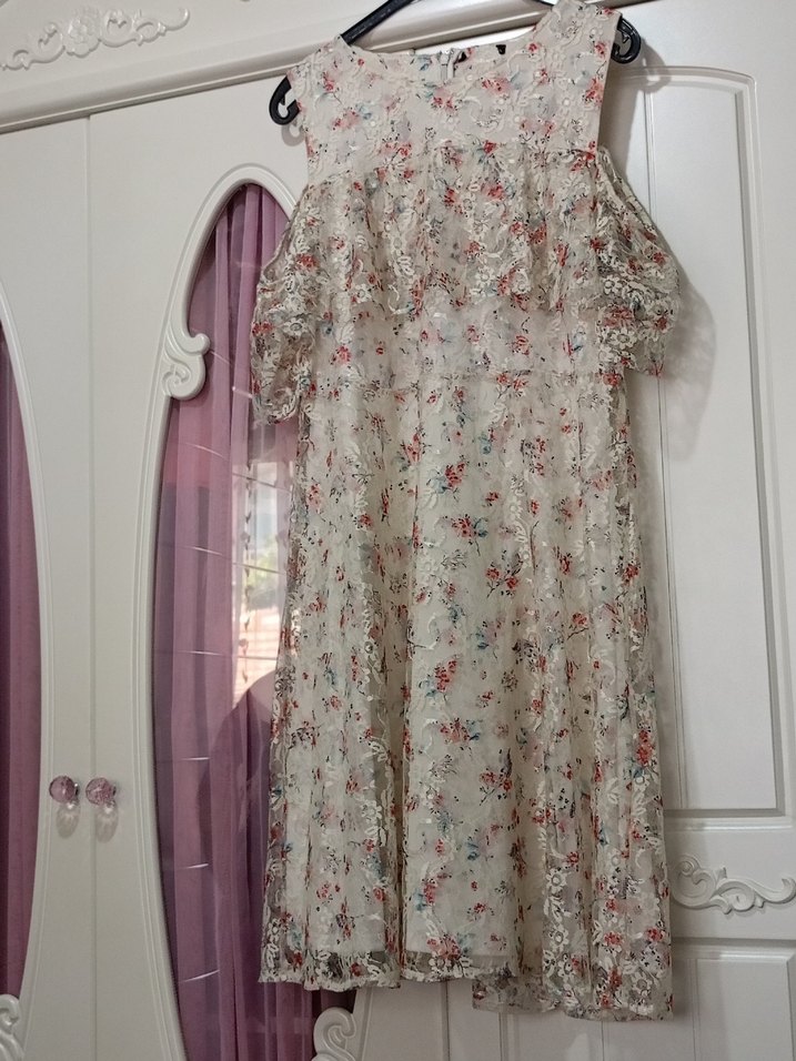 Bej renkte, çiçek desenli ve dantel detaylı midi uzunlukta, salaş kesim bohem elbise. Askısız ve kolsuz tasarımıyla düğünlerde tercih edilebilir.