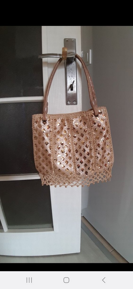 Dantel detaylı, nakışlı desenlere sahip parlak bej deri kadın çanta. Bohem tarzına uygun, günlük kullanıma ideal.